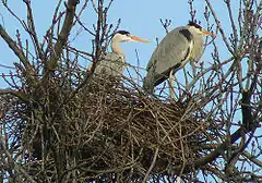 Серая цапля обычно гнездится группами, или колониями. Чаще всего в колонии бывает 10—20 гнезд, иногда больше. Обычно в большинстве районов обитания цапель в самых больших колониях бывает не более 200 птиц, однако в исключительных случаях их число может приближаться к 1000[28]. В Европе крупнейшие современные колонии цапель превышают 1 тыс. гнезд[30]. В то же время довольно часто цапли гнездятся отдельными парами. Во многих местах цапли образуют самостоятельные колонии, в других — гнездятся совместно с цаплями других видов, бакланами, колпицами, ибисами, каравайками. Колонии, состоящие только из серых цапель без других птиц, свойственны северным частям ареала (в частности, Средней полосе России). Тем не менее, в этих районах к колониям цапель могут присоединяться отдельные пары хищных птиц, таких как крупные и мелкие соколы (сапсан, пустельга, чеглок), иногда беркут, ушастая сова, а также серые вороны и грачи[13].