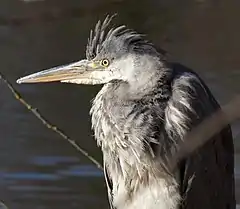 - Птицы в конце первого года жизни и начале второго. Верх головы серый, с чёрными полосками, затылок черноватый, но при этом чёрные перья короче, чем у взрослых особей.