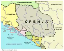 По данным византийского императора Константина Багрянородного, сербы появились на Балканах в 1-й половине VII века[2]. Они заняли территории современных Сербии, Черногории, Боснии и Хорватии[3]. После переселения на Балканский полуостров первыми территориальными объединениями у сербов, как и у большинства южных славян, были жупы. Жупы обычно занимали районы, ограниченные течением рек или горами. Их центрами являлись укреплённые поселения или города. Как административные территориальные единицы жупы в дальнейшем стали прочной основой Сербского государства[4]. Однако византийцы все эти земли назвали «склавинии». После расселения славян на Балканах в византийских источниках появляются сведения о множестве склавиний от Салоник до Константинополя, а позднее и о склавиниях, расположенных выше городов на далматинском побережье[5].