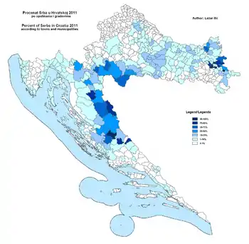 Наибольшее число сербов в Хорватии проживает в Загребе. Также большое число сербов проживает в Бании, Кордуне, Лике, Северной Далмации, Славонии, Западном Среме и Бараньи. Небольшое число сербов проживает в южной Далмации, Билогоре, Мославине, Горском Котаре и Истрии. В 17 муниципальных общинах в Хорватии сербы составляют большинство населения. В 1971 году было зафиксировано наибольшее число сербов, проживающих в Хорватии (626 000 человек или 14 % населения). Число сербов в 1991 году (более 580 000) было всё ещё значительно выше показателя 2001 года, когда количество, согласно данным хорватской переписи населения, составило чуть больше 200 000 человек[1].