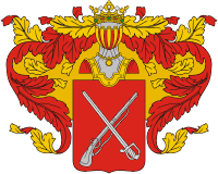 Щит увенчан дворянским шлемом и короной. Намёт на щите красный, подложенный золотом.