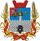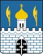 В лазоревом поле щита серебряная зубчатая, мурованная лазурью стена с чёрными воротами с серебряными скрепами на них, из-за которых возникает серебряная башня с золотым церковным куполом, который увенчан шестиконечным Голгофским крестом. По сторонам башни расположены два золотых бердыша в столб, лезвия которых обращены вправо.