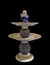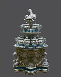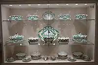 - Сервиз с зелёными лентами. Этот подарок французского короля Людовика XV императрице Марии Терезии стал символом изменений в политике европейских союзников после австро-прусских войн за наследство и сближения Австрии и Франции в 1756 г. Два года спустя Севрская фарфоровая мануфактура поставила королевскому дому Франции столовый и десертный сервиз, состоящий из 185 предметов, 38 образующих горку статуэток и 116 других изделий из фарфора, таких как принадлежности для завтрака, вазы для ароматизированных лепестков, бокалы, чайники и кофейники, фонтаны, ночные горшки, розетки для паштетов и рукомойники. Кроме того была поставлена и десертная горка, состоящая из 21 части. Сохранилось 45 предметов из этого сервиза, все статуэтки и горки пропали. Два соусника, скопированных на Венской фарфоровой мануфактуре, свидетельствуют о попытках замены недостающих предметов в самой Австрии[19].