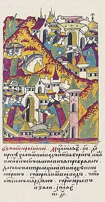 ![]() «В месяце июле в 25 день приехали от воевод князь Борис, сын князя Василия Семеновича Серебряного, и голова стрелецкий Тимофей Тетерин, говорили от (имени) воевод, что Божьим милосердием город Юрьев взяли (месяца) июля в 18 день» | |