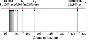 | Длина волны, нм | 121,6 | 102,5 | 97,2 | 94,9 | 93,7 | 93,0 | 92,6 | 92,3 | 92,1 | 91,9 | 91,15 |
