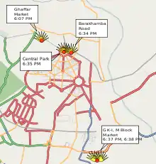 Первая бомба сработала в торговом квартале «Коннот-Плейс», второй взрыв серии прозвучал на людной улице в районе «Грейтер Кайлаш», третья бомба сработала неподалеку от квартала «Кароль Баг». Последние две — на парковке одного из торговых центров[3].