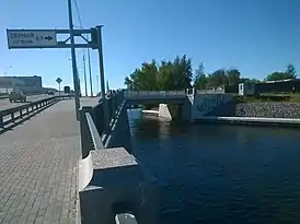 Мост однопролётный железобетонный балочный. Пролётное строение из сборных железобетонных балок длиной 18 м. В поперечнике состоит из 6 преднапряжённых балок двутаврового сечения с шагом между балками 2,2 м. Опоры из монолитного железобетона на высоком свайном ростверке с двумя рядами свай-оболочек диаметром 0,6 м длиной 18 м и передней стенкой из металлического шпунта длиной 18 м[9]. Опоры являются продолжением набережной, ростверк опор совмещен с ростверком набережной. Лицевая поверхность опор облицована гранитными плитами[10]. Длина моста составляет 18,73 м, ширина — 13 м (в том числе: проезжая часть 2х3,50, полосы безопасности 2х1,0 м, тротуары 2х1,5 м)[9].