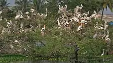 Стая серых пеликанов в национальном парке Бундала, Шри-Ланка