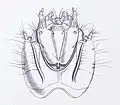 Переднегрудной сегмент значительно короче суммы двух последующих. Края площадки каудального сегмента с шестью-семью острыми хитинизированными бугорками, наружные ветви урогомф в два раза шире и значительно длиннее внутренних урогомф[4].