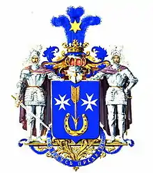 В лазуревом щите, золотая опрокинутая в столб стрела, сопровождаемая по бокам двумя серебряными Мальтийскими крестами, а в оконечности — золотою подковою шипами вверх. Щит увенчан Дворянским коронованным шлемом. Нашлемник: три лазуревых страусовых пера, из коих среднее обременено золотою о шести лучах звездою. Намёт: лазуревый с золотом. Щитодержатели: два рыцаря в серебряных латах, с серебряными перьями на шлемах; правый рыцарь держит в руке серебряный с золотою рукоятью меч. Девиз: «Горжусь предками», золотыми буквами на лазуревой ленте.