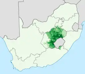 ![]() Распространение языка южный сото в ЮАР, доля населения, говорящая на языке дома: 0–20% 20–40% 40–60% 60–80% 80–100% | |