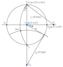 Для построения меридианов сетки с выбранным шагом, вычисляйте положение вспомогательной точки , находящейся на луче на расстоянии от какого-либо полюса. Взяв точку в качестве центра, прочертите между полюсами и дугу радиусом ; меридиан долготы построен. Меридианы второй половины сетки строятся таким же образом, но вспомогательные точки располагаются на луче .