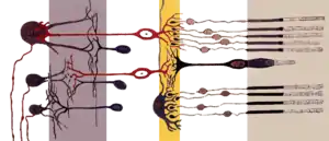 Кроме фоторецепторных и ганглионарных нейронов, в сетчатке присутствуют и биполярные нервные клетки, которые, располагаясь между первыми и вторыми, осуществляют между ними контакты, а также горизонтальные и амакриновые клетки, осуществляющие горизонтальные связи в сетчатке.