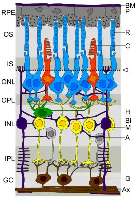 Зрительная часть сетчатки имеет неоднородное слоистое строение, доступное для изучения лишь на микроскопическом уровне и состоит из 10[3] следующих вглубь глазного яблока слоёв: