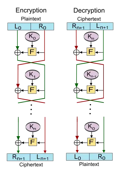 Результатом выполнения раундов является . В N-м раунде перестановка и не производится, чтобы была возможность использовать ту же процедуру и для расшифрования, просто инвертировав порядок использования ключей ( вместо ):