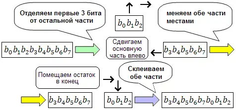 В простейшем случае (сдвиг на 1 бит), крайний бит отщепляется и перемещается на другой конец регистра или шины. В зависимости от того какой бит берётся, правый или левый, сдвиг называется вправо или влево. Сдвиги на большее число бит можно рассматривать, как многократное применение сдвига на 1.