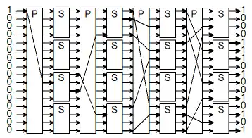 Рассмотрим теперь, как будет меняться шифротекст, в приведённом выше алгоритме, при изменении всего одного бита. Для простоты возьмём таблицы замен s-блоков такими, что если на вход s-блока подаются все нули, то и на выходе будут все нули. В силу нашего выбора s-блоков, если на вход шифрующего устройства подаются все нули, то и на выходе устройства будут все нули. В реальных системах такие таблицы замен не используются, так как они сильно упрощают работу криптоаналитика, но в нашем примере они наглядно иллюстрируют сильную межсимвольную взаимосвязь при изменении одного бита шифруемого сообщения. Видно, что благодаря первому p-блоку единственная единица сдвигается перемещается в центр блока, затем следующий нелинейный s-блок «размножает» её, и уже две единицы за счёт следующего p-блока изменяют своё положение и т. д. В конце устройства шифрования, благодаря сильной межсимвольной связи, выходные биты стали сложной функцией от входных и от используемого ключа. В среднем на выходе половина бит будет равна «0» и половина — «1».