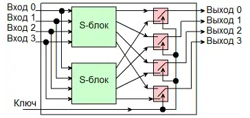 - результат разбивается на 8 4-битных блоков, которые подаются на вход 4-разрядных s-блоков (которые могут быть различными);