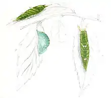 Гусеницы монофаги — трофически связаны с дубами. В России питаются на дубе монгольском. Гусеницы зелёного цвета с красными пятнами между спинными шипами и двумя остриями на анальном сегменте, слизневидные. При питании располагаются на листьях кормового растения вдоль главных жилок, что характерно для данного вида. Стадия гусеницы протекает в июне — начале июля.