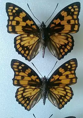 Длина переднего крыла 34—36 мм. Размах крыльев 65—70 мм. Верхняя сторона крыльев самца жёлто-оранжевая или красновато-коричневая с рисунком, образованным тёмно-коричневыми пятнами и полосами. Нижняя сторона крыльев похожа на верхнюю, но у вершины передних крыльев, в прикорневой и средней частях задних крыльев находятся продольные белые пятна. У самки на крыльях вместо жёлто-оранжевых и красновато-коричневых — белые элементы рисунка, за исключением пятна в срединной ячейке переднего крыла.