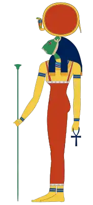 Во времена Позднего периода — в виде лежащего на пьедестале Ихневмона или кобры на лестнице, напротив неё находится бабуин с диском на голове, жертвующий глаз — Уаджет (а также змеи, имеющей голову льва). В Саисский период изображена крадущейся львицей в короне Атеф, извергающая огонь.