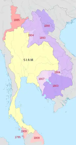 Сиам был самым могущественным и крупнейшим тайским государством в Индокитае, включая вассальные государства Камбоджа, Ланна, Лаос, Пегу, а также части Малайзии. Царство было основано династией Phra Raung и просуществовало до 1932 года. Первоначально Королевством Сиам правили кхмеры, пока в 1238 году тайцы не добились независимости. Во времена правления Рамкамхенга, сына Си Индрадитья, Сукотаи был могущественным Королевством, имеющим связи с Монгольской империей. После смерти Рамкамхенга, Королевство Сукотаи пришло в упадок и было завоевано Королевством Аютия после многолетней войны. Аютия завоевали Ангкор, Сукотаи, Табмбралинга. Позже Королевство Аютия воевало с Ланна, затем с Бирмой (во времена династии Тоунгоа), и Бирма разграбила Аютию. В Тхонбури (сейчас район Бангкока) правил король Пхрайя Таксин. Король Таксин вёл войны с Ланной и другими царствами, чтобы воссоединить Сиам.