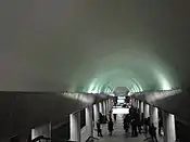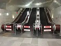 Оба вестибюля связаны с платформой трёхленточными эскалаторами. Каждая лента имеет длину 30 метров[2]. С 2011 года на перилах каждого эскалатора наклеены специальные фотолюминесцентные эвакуационные ленты, имеющие салатный цвет. Они предназначены на случай чрезвычайной ситуации и в темноте указатели на лентах укажут направления выходов[5].