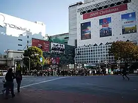 ![]() Вид на здание станции Сибуя небоскрёб Shibuya Scramble Square с Сибуйского диагонального пешеходного перехода перед станцией (23 июля 2019) | |