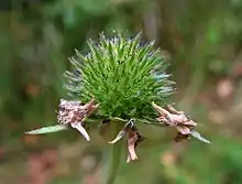 Цветки — с голубоватым или беловатым венчиком; собраны в полушаровидные головки, внешне похожие на корзинки растений семейства Астровые (Сложноцветные)[17]. Соцветия — на длинных цветоносах; обёртки соцветий двурядные, с травянистыми листочками. Прицветники длиннее бутонов[14], эллиптические, плёнчатые[15].