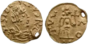 ![]() Золотой тремисс франкского короля Сигиберта I, чеканен в Реймсе. Национальная библиотека Франции, кабинет медалей, Париж | |