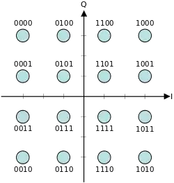 | Двоичная фазовая манипуляция (BPSK) | Квадратурная фазовая манипуляция (QPSK) | Восьмеричная фазовая манипуляция (8-PSK) | Сигнальное созвездие для прямоугольной 16-КАМн. |