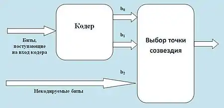 Если используется комбинированный кодер/модулятор, общая структура которого показана на рисунке, то бит b0 позволяет выбрать одно из двух созвездий, которые получились при первом разделении. Далее выбор определяется в зависимости от битов b1 и b2.
