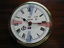 Часы радиста. Цветными секторами на циферблате обозначены трехминутные периоды радиомолчания, когда все служебные станции должны прослушивать частоты сигналов бедствия: красные — 500 кГц, синие — 2174,5, 2182 и 2187,5 кГц
