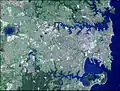 Фотография Сиднея, сделанная из космоса. В верхней правой части снимка виден протяжённый и извилистый залив Порт-Джэксон. В южной части располагается залив Ботани