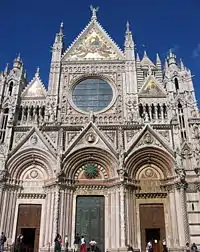 Расцвет торговли и банковского дела в Сиене в XII веке способствовал интенсивному градостроительству. Это время считается периодом наивысшего подъёма сиенской архитектуры романского стиля, воплотившегося в строительстве таких шедевров итальянской архитектуры, как кафедральный собор Сиены и Пьяцца-дель-Кампо. Их возведение началось в XII веке, однако продолжалось достаточно долго, чтобы впитать в себя готические элементы. Пьяцца-дель-Кампо с возведённым на ней в XIV веке Общественным дворцом (итал. Palazzo Pubblico) в настоящее время считается одной из красивейших площадей Европы.