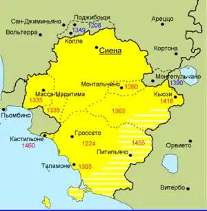 Более успешным было южное направление территориальной экспансии Сиенской республики: в 1224 году было присоединено Гроссето, город, доминирующий над самой южной частью Тосканы и частью побережья.