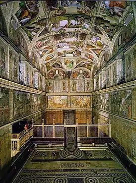Сикстинская капелла была сооружена на месте, где до неё существовала «Большая капелла» (итал. Cappella Maggiore), в которой в эпоху Средневековья собирался папский двор, состоявший примерно из двухсот членов — кардиналов, представителей различных религиозных орденов и знатных семейств. Римский папа Сикст IV опасался военной угрозы со стороны флорентийской Синьории Медичи, с которой находился в напряжённых отношениях, и от Мехмеда II, чьи войска представляли потенциальную опасность для восточных берегов Италии. Поэтому он решил укрепить эту постройку. Проект создал архитектор Баччо Понтелли, а работы велись под руководством Джордже де Дольчи. Прямоугольное в плане помещение украшено настенными росписями, выполненными в 1481—1483 годах Сандро Боттичелли, Пинтуриккьо и другими мастерами по заказу Сикста IV. В 1508—1512 годах Микеланджело расписывал свод с люнетами и распалубками по заказу папы Юлия II. 31 октября 1512 года папа Юлий II отслужил торжественную вечерню в честь создания фресок на своде Сикстинской капеллы. 31 октября 2012 года, в тот же час, папа Бенедикт XVI повторил торжественную церемонию в честь 500-летнего юбилея этого события.