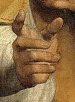Ещё одна деталь: изобразительная криптограмма. Святой Сикст изображён Рафаэлем с шестью пальцами на правой руке, поскольку он «Сикст» ((лат. sextus — шестой). На самом деле кажущийся шестой палец (мизинец) является частью внутренней стороны ладони.