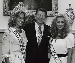 ![]() Шоун Уэтерли, Рональд Рейган и Ким Силбрид в Овальном кабинете в 1981 году | |