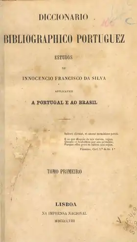 - Silva I. F. da. Diccionario bibliographico portuguez : Estudos de Innocencio Francisco da Silva applicaveis a Portugal e ao Brasil : [порт.] : in 23 vol. / Inocêncio Francisco da Silva. — Lisboa : Imprensa Nacional, 1858. — Vol. I. — LX, 403 p.