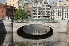 Наплавной мост был построен здесь в 1760-х годах на месте существовавшего ранее перевоза[4]. В 1776 году был построен постоянный трёхпролётный деревянный мост[5]. В 1836 году по проекту архитектора Федотова построен арочный однопролетный мост на деревянных устоях[6][7]. Мост неоднократно ремонтировался в дереве: в 1864[8][9][10], 1876 (укреплён для прокладки по нему линии конно-железной дороги)[11][12], 1878[13][14], 1893[15][16] годах. В 1902 году городская дума рассматривала вопрос о замене деревянного моста железобетонным, но решение не было принято[17]. В 1906 году мост был усилен для прокладки трамвайной линии. Работы производились комиссией городской думы по заведыванию общественными работами[18]. К началу XX века это был трёхпролётный деревянный свайный мост ригельно-подкосной системы. Длина по настилу составляла 35 м, ширина — около 18 м[8].