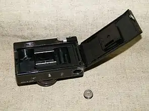 - Корпус — пластмассовый, с откидной задней пластмассовой крышкой. На крышке находится шкала-памятка светочувствительности заряженной фотоплёнки.