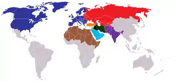 - Западный мир — США, Канада, все страны Европы кроме России, Белоруссии, Украины, Молдавии, Латвии, Литвы и Эстонии