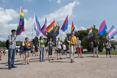 | Флаг трансгендерных персон | Флаг бисексуалов | Пурпурная рука «Фронта освобождения геев» | Символ равенства «Кампании за права человека» |