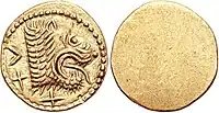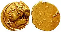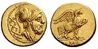 В 209 году до н. э. римская республика впервые выпустила ограниченный тираж золотых монет весом 1, 2, 3 и 6 скрупулов. Их номиналы обозначены римскими цифрами XX, XXXX и LX (монета в 6 скрупулов без указания номинала). В каталоге Майкла Кроуфорда Roman Republican Coinage (RRC) эти цифры расшифрованы как достоинство монеты в ассах[42]. Гарольд Мэттингли считает, что номиналы выражены в сестерциях, которые постепенно становились базовой счётной единицей[43]. Аналогичные номиналы (например, X или XXV) появились и на золотых монетах некоторых римских провинций.