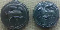 На ассах чеканили римскую цифру I, номинал монеты. Более крупными медными монетами были дупондий, трипондий (трессис), квинкуссис и декуссис[34]. Их номиналы соответствовали стоимости в ассах и обозначались римскими цифрами II, III, V и X соответственно. Кроме того, выпускалась монета достоинством 4 асса — квадруссис, однако на ней номинал не проставлялся[35][36].