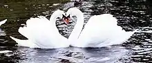 - Пара лебедей, подплывающих навстречу друг другу, в момент касания образует форму сердца. Лебеди являются символом любви, верности и преданности, так как сформированная пара остается вместе на всю жизнь[3], что в мире животных наблюдается крайне редко[4].