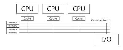 Второй способ соединения процессоров — через коммутируемое соединение (crossbar switch)[3][5]. При таком соединении вся общая память делится на банки памяти, каждый банк памяти имеет свою собственную шину, и процессоры соединены со всеми шинами, имея доступ по ним к любому из банков памяти. Такое соединение схемотехнически более сложное, но оно позволяет процессорам обращаться к общей памяти одновременно. Это позволяет увеличить количество процессоров в системе до 8-16 без заметного снижения общей производительности. Примером таких SMP-машин являются многопроцессорные рабочие станции RS/6000.