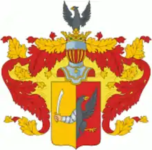 Щит увенчан обыкновенным дворянским шлемом с дворянской на нём короной, на поверхности которой находится вылетающий чёрный одноглавый орёл с распростёртыми крыльями. Намёт на щите красный, подложен золотом.