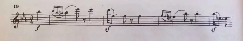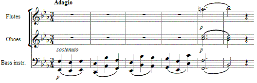 Сначала тема звучит тихо и легко у струнных инструментов, затем громко — у всего оркестра.